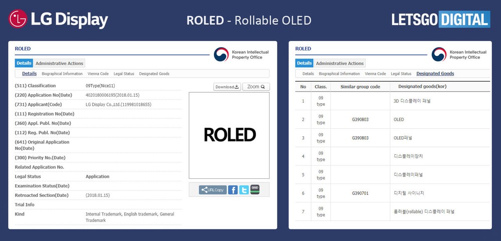 LG Display ha depositato il marchio ROLED tramite il Korea Intellectual Property Rights Information Service (KIPRIS). ROLED è l'acronimo di Rollable OLED, ovvero OLED arrotolabile. Parliamo quindi di TV come il prototipo Ultra HD da 65" mostrato al CES 2018. Il marchio è stato depositato come "Class 09", una categoria che include pannelli 3D, pannelli OLED, display, display arrotolabili, TV arrotolabili, smartphone, computer e TV.
